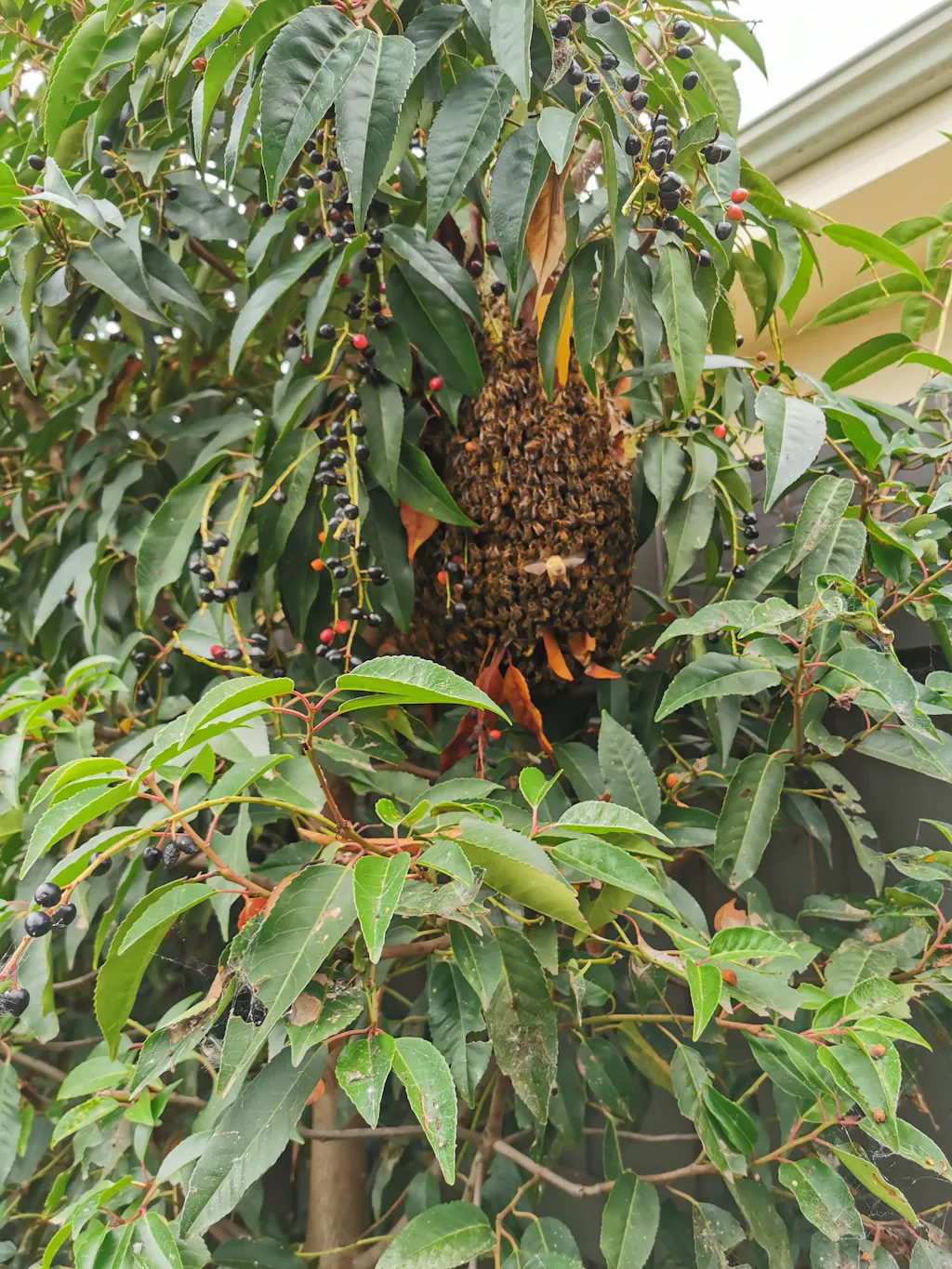 A swarm of honeybees will cluster temporarily at one location, often hanging off the branch of a tree or bush, while a few scout bees locate a new home. When a suitable home is found the swarm moves as a group to that new site. This is usually after a few hours or up to a couple of days.