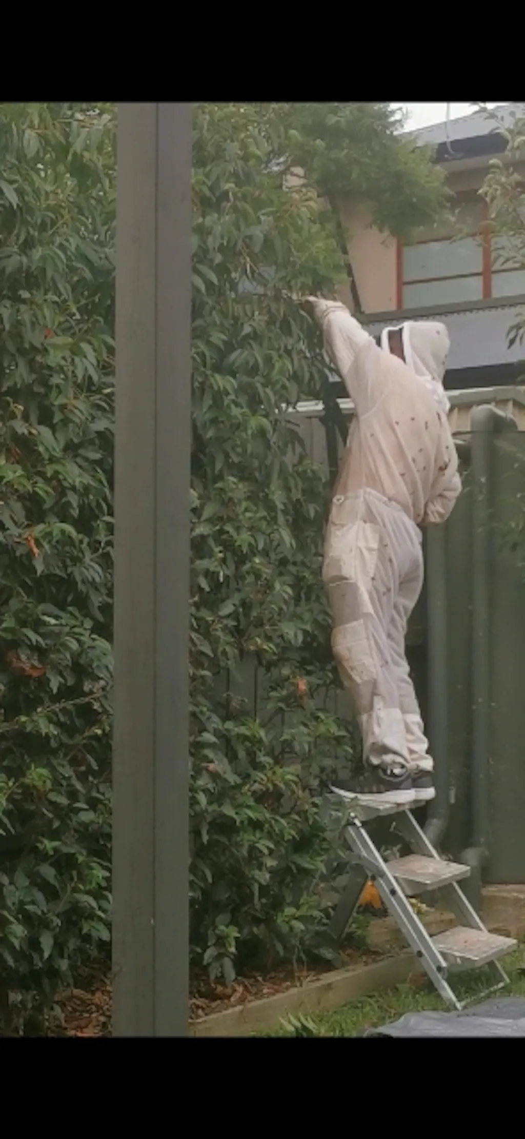 The honey bee are generally at their most passive state when swarming. They will most likely not attack if they are not provoked. Don’t spray the bees with insecticides or water. Bees sprayed can often provoke them to sting you.